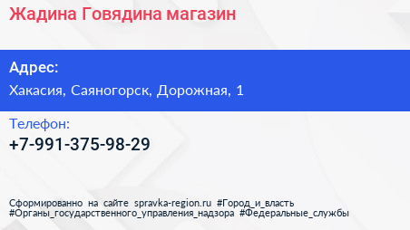 Жадина-Говядина, магазин по адресу Хакасия, Саяногорск, Дорожная, 1 в дальнейшем Организация, размещена в следующих категориях: