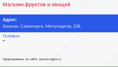 Магазин фруктов и овощей по адресу Хакасия, Саяногорск, Металлургов, 25Б в дальнейшем Организация, размещена в следующих категориях: