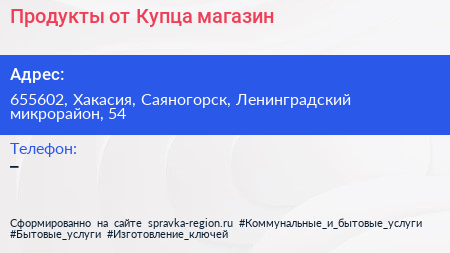 Продукты от Купца, магазин по адресу 655602, Хакасия, Саяногорск, Ленинградский микрорайон, 54 в дальнейшем Организация, размещена в следующих категориях:
