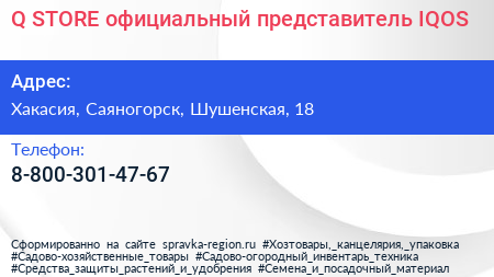 Q STORE, официальный представитель IQOS по адресу Хакасия, Саяногорск, Шушенская, 18 в дальнейшем Организация, размещена в следующих категориях: