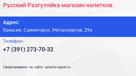 Русский Разгуляйка, магазин напитков по адресу Хакасия, Саяногорск, Металлургов, 29а в дальнейшем Организация, размещена в следующих категориях: