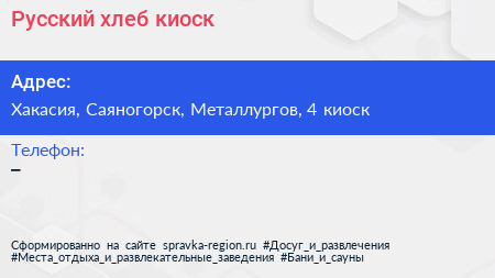 Русский хлеб, киоск по адресу Хакасия, Саяногорск, Металлургов, 4 киоск в дальнейшем Организация, размещена в следующих категориях: