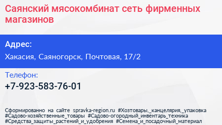 Саянский мясокомбинат, сеть фирменных магазинов по адресу Хакасия, Саяногорск, Почтовая, 17/2 в дальнейшем Организация, размещена в следующих категориях: