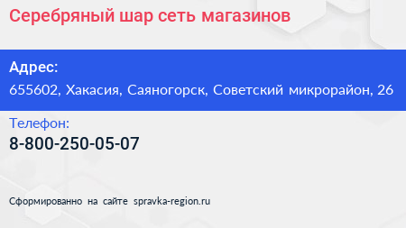 Серебряный шар, сеть магазинов по адресу 655602, Хакасия, Саяногорск, Советский микрорайон, 26 в дальнейшем Организация, размещена в следующих категориях: