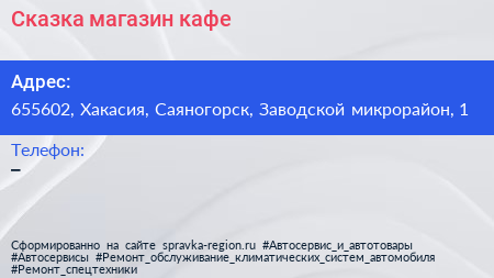 Сказка, магазин-кафе по адресу 655602, Хакасия, Саяногорск, Заводской микрорайон, 1 в дальнейшем Организация, размещена в следующих категориях: