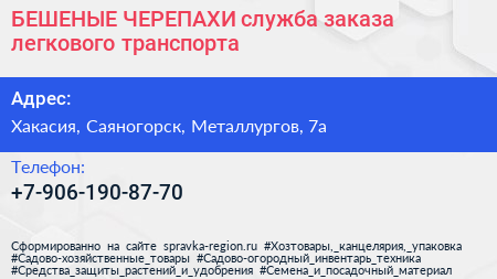 БЕШЕНЫЕ ЧЕРЕПАХИ, служба заказа легкового транспорта по адресу Хакасия, Саяногорск, Металлургов, 7а в дальнейшем Организация, размещена в следующих категориях: