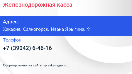 Железнодорожная касса по адресу Хакасия, Саяногорск, Ивана Ярыгина, 9 в дальнейшем Организация, размещена в следующих категориях: