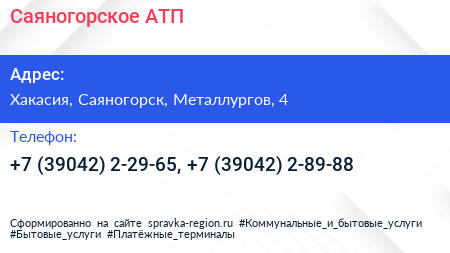 Саяногорское АТП по адресу Хакасия, Саяногорск, Металлургов, 4 в дальнейшем Организация, размещена в следующих категориях: