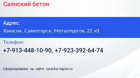 Саянский бетон по адресу Хакасия, Саяногорск, Металлургов, 22 к1 в дальнейшем Организация, размещена в следующих категориях: