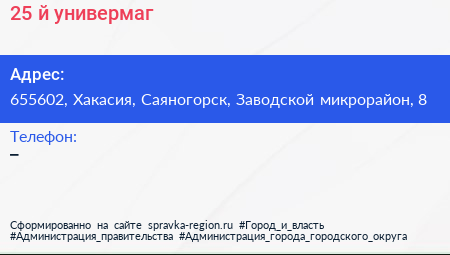 25-й, универмаг по адресу 655602, Хакасия, Саяногорск, Заводской микрорайон, 8 в дальнейшем Организация, размещена в следующих категориях: