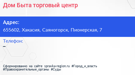 Дом Быта, торговый центр по адресу 655602, Хакасия, Саяногорск, Пионерская, 7 в дальнейшем Организация, размещена в следующих категориях: