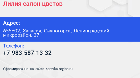 Лилия, салон цветов по адресу 655602, Хакасия, Саяногорск, Ленинградский микрорайон, 37 в дальнейшем Организация, размещена в следующих категориях: