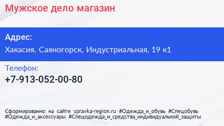 Мужское дело, магазин по адресу Хакасия, Саяногорск, Индустриальная, 19 к1 в дальнейшем Организация, размещена в следующих категориях: