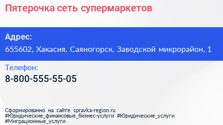 Пятерочка, сеть супермаркетов по адресу 655602, Хакасия, Саяногорск, Заводской микрорайон, 1 в дальнейшем Организация, размещена в следующих категориях: