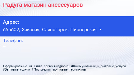 Радуга, магазин аксессуаров по адресу 655602, Хакасия, Саяногорск, Пионерская, 7 в дальнейшем Организация, размещена в следующих категориях: