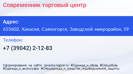Современник, торговый центр по адресу 655602, Хакасия, Саяногорск, Заводской микрорайон, 59 в дальнейшем Организация, размещена в следующих категориях: