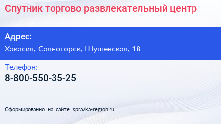 Спутник, торгово-развлекательный центр по адресу Хакасия, Саяногорск, Шушенская, 18 в дальнейшем Организация, размещена в следующих категориях: