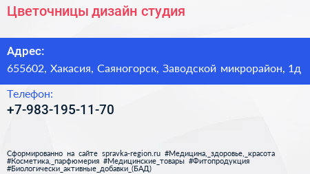 Цветочницы, дизайн-студия по адресу 655602, Хакасия, Саяногорск, Заводской микрорайон, 1д в дальнейшем Организация, размещена в следующих категориях: