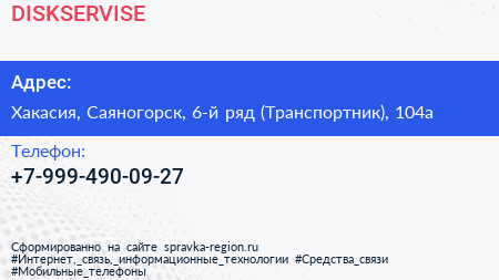 DISKSERVISE по адресу Хакасия, Саяногорск, 6-й ряд (Транспортник), 104а в дальнейшем Организация, размещена в следующих категориях: