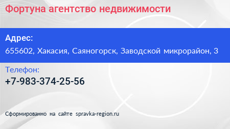 Фортуна, агентство недвижимости по адресу 655602, Хакасия, Саяногорск, Заводской микрорайон, 3 в дальнейшем Организация, размещена в следующих категориях: