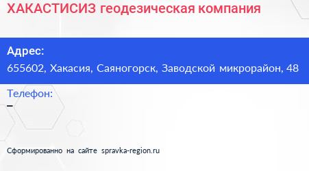 ХАКАСТИСИЗ, геодезическая компания по адресу 655602, Хакасия, Саяногорск, Заводской микрорайон, 48 в дальнейшем Организация, размещена в следующих категориях: