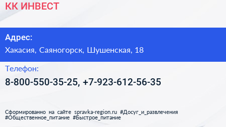 КК-ИНВЕСТ по адресу Хакасия, Саяногорск, Шушенская, 18 в дальнейшем Организация, размещена в следующих категориях: