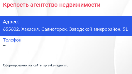 Крепость, агентство недвижимости по адресу 655602, Хакасия, Саяногорск, Заводской микрорайон, 51 в дальнейшем Организация, размещена в следующих категориях: