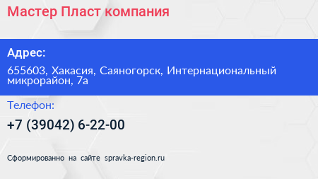Мастер Пласт, компания по адресу 655603, Хакасия, Саяногорск, Интернациональный микрорайон, 7а в дальнейшем Организация, размещена в следующих категориях:
