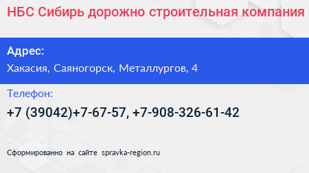 НБС-Сибирь, дорожно-строительная компания по адресу Хакасия, Саяногорск, Металлургов, 4 в дальнейшем Организация, размещена в следующих категориях:
