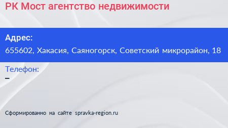РК Мост, агентство недвижимости по адресу 655602, Хакасия, Саяногорск, Советский микрорайон, 18 в дальнейшем Организация, размещена в следующих категориях: