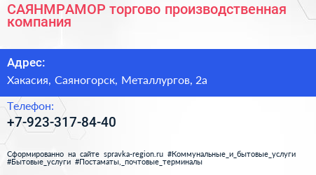 САЯНМРАМОР, торгово-производственная компания по адресу Хакасия, Саяногорск, Металлургов, 2а в дальнейшем Организация, размещена в следующих категориях: