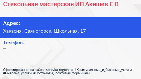 Стекольная мастерская, ИП Акишев Е.В. по адресу Хакасия, Саяногорск, Школьная, 17 в дальнейшем Организация, размещена в следующих категориях: