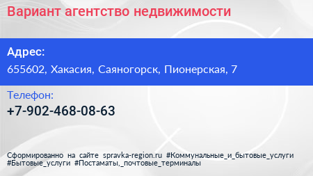 Вариант, агентство недвижимости по адресу 655602, Хакасия, Саяногорск, Пионерская, 7 в дальнейшем Организация, размещена в следующих категориях: