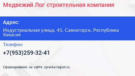 Медвежий Лог, строительная компания по адресу Индустриальная улица, 45, Саяногорск, Республика Хакасия в дальнейшем Организация, размещена в следующих категориях:
