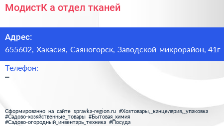 МодистК-а, отдел тканей по адресу 655602, Хакасия, Саяногорск, Заводской микрорайон, 41г в дальнейшем Организация, размещена в следующих категориях: