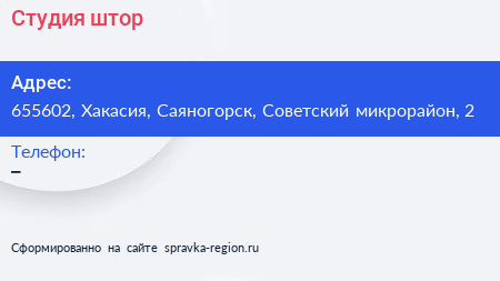Студия штор по адресу 655602, Хакасия, Саяногорск, Советский микрорайон, 2 в дальнейшем Организация, размещена в следующих категориях: