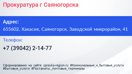 Прокуратура г. Саяногорска по адресу 655602, Хакасия, Саяногорск, Заводской микрорайон, 41 в дальнейшем Организация, размещена в следующих категориях: