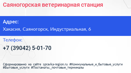 Саяногорская ветеринарная станция по адресу Хакасия, Саяногорск, Индустриальная, 6 в дальнейшем Организация, размещена в следующих категориях: