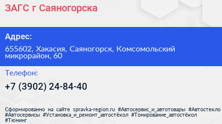 ЗАГС г. Саяногорска по адресу 655602, Хакасия, Саяногорск, Комсомольский микрорайон, 60 в дальнейшем Организация, размещена в следующих категориях: