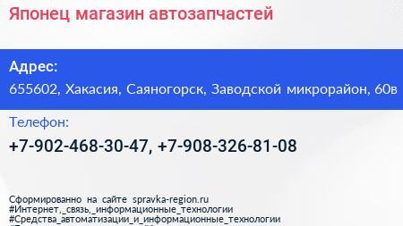 Японец, магазин автозапчастей по адресу 655602, Хакасия, Саяногорск, Заводской микрорайон, 60в в дальнейшем Организация, размещена в следующих категориях: