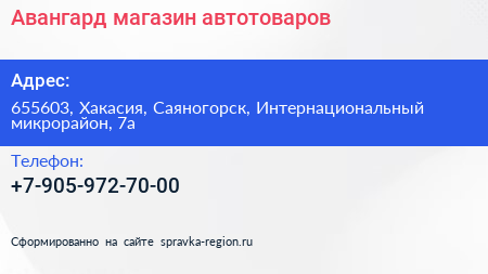 Авангард, магазин автотоваров по адресу 655603, Хакасия, Саяногорск, Интернациональный микрорайон, 7а в дальнейшем Организация, размещена в следующих категориях: