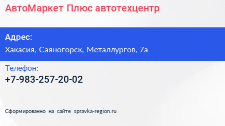 АвтоМаркет Плюс, автотехцентр по адресу Хакасия, Саяногорск, Металлургов, 7а в дальнейшем Организация, размещена в следующих категориях: