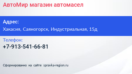 АвтоМир, магазин автомасел по адресу Хакасия, Саяногорск, Индустриальная, 15д в дальнейшем Организация, размещена в следующих категориях: