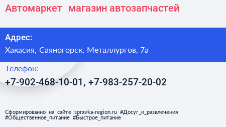 Автомаркет+, магазин автозапчастей по адресу Хакасия, Саяногорск, Металлургов, 7а в дальнейшем Организация, размещена в следующих категориях: