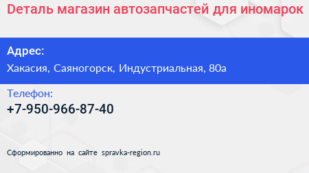 Deталь, магазин автозапчастей для иномарок по адресу Хакасия, Саяногорск, Индустриальная, 80а в дальнейшем Организация, размещена в следующих категориях: