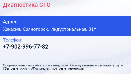 Диагностика, СТО по адресу Хакасия, Саяногорск, Индустриальная, 31т в дальнейшем Организация, размещена в следующих категориях: