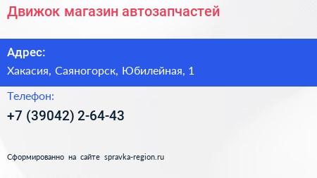 Движок, магазин автозапчастей по адресу Хакасия, Саяногорск, Юбилейная, 1 в дальнейшем Организация, размещена в следующих категориях:
