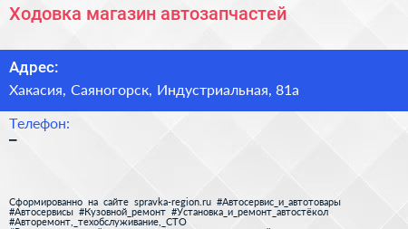 Ходовка, магазин автозапчастей по адресу Хакасия, Саяногорск, Индустриальная, 81а в дальнейшем Организация, размещена в следующих категориях: