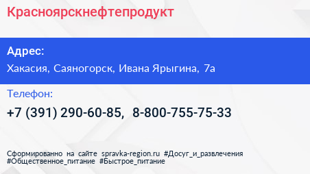 Красноярскнефтепродукт по адресу Хакасия, Саяногорск, Ивана Ярыгина, 7а в дальнейшем Организация, размещена в следующих категориях: