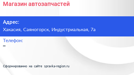 Магазин автозапчастей по адресу Хакасия, Саяногорск, Индустриальная, 7а в дальнейшем Организация, размещена в следующих категориях: